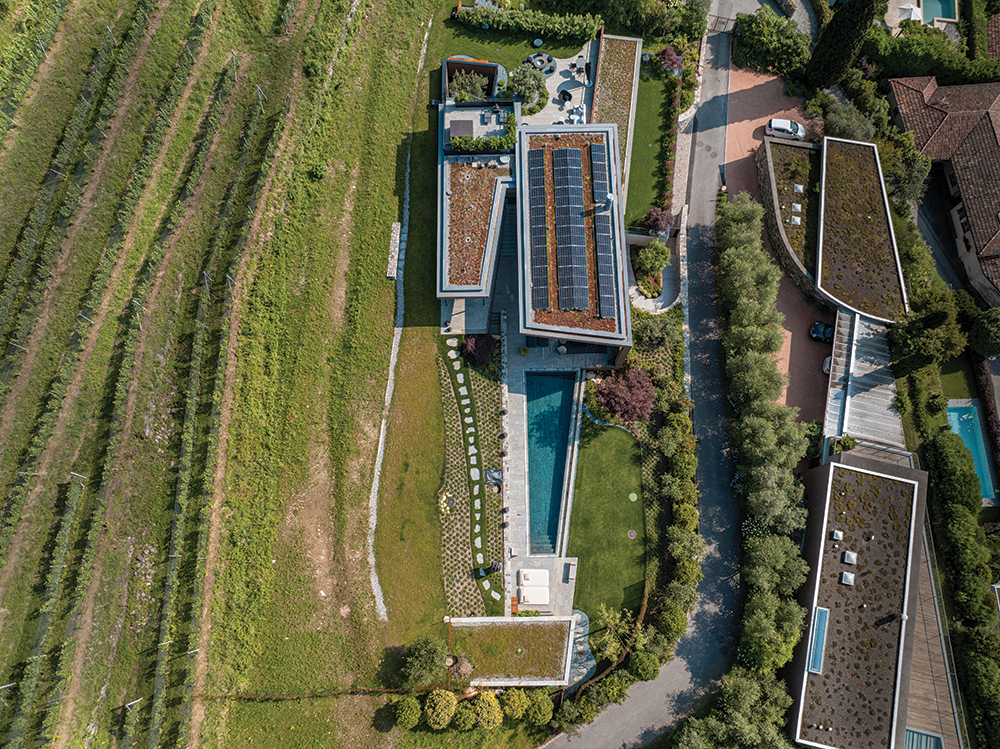 The waterproofing of the inhabited hypogeum and swimming pool of a villa bordering a vineyard, set in terraces that continue seamlessly across the property. To adhere to this movement, the emerging volumes are staggered by half a floor: two transparent pavilions on which the living area is developed.
