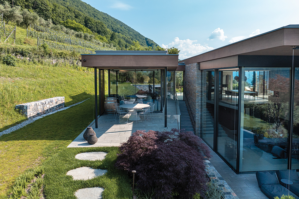 L’impermeabilizzazione dell’ipogeo abitato e della piscina di una villa che confina con un vigneto, incastonata nel terrazzamento che prosegue senza soluzione di continuità nella proprietà. Per aderire a questo movimento i volumi emergenti sono sfalsati di mezzo piano: due padiglioni trasparenti in sui di sviluppa la zona giorno.